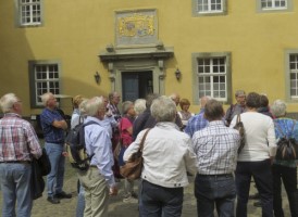 Het bezoek aan het voormalige cisterciënzer vrouwenklooster Graefenthal (bij Goch) en aan de kerk van Asperden. Hoewel de hemel in eerste instantie dreigend leek, was dat voor 45 leden van de Historische Kring geen reden om thuis te blijven. Ruim voordat onze gids arriveerde, waren al velen aanwezig en koesterden zich op een terrasje in het doorbrekende zonnetje. De gids vertelde in amusant ‘plat’ Diets de geschiedenis van het vrouwenklooster in het ‘Dal van de Graaf’ (stichter graaf Otto II in juni 1255, wiens grafmonument nog aanwezig is) perfect en met de nodige humor. Hij leidde ons gezelschap van het poorthuis, langs de duiventoren, de voormalige bierbrouwerij en stallen, naar de zolders van het hoofdgebouw, met de bijzondere dakconstructie welke uit de 15e eeuw stamt en vele stormen perfect heeft overleefd. Overigens met dank aan de tegenwoordige bezitter Ysbrand Rovers (Heijen), die sedert een drietal jaren actief bezig is met de restauratie van het goed.