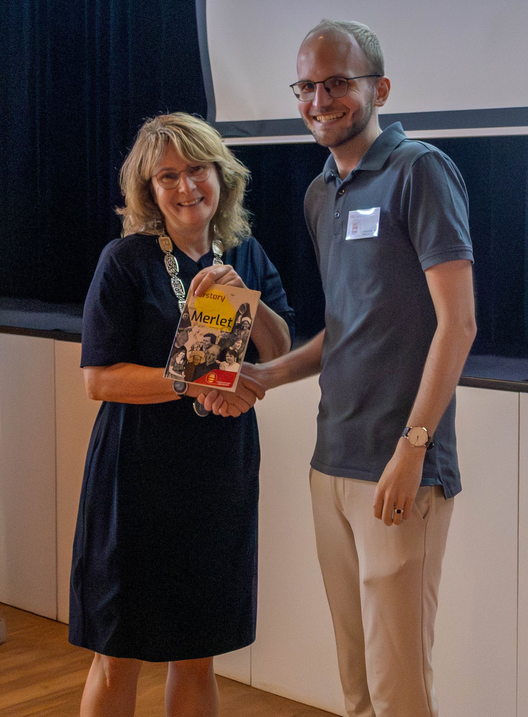 Burgemeester Marieke Moorman van gemeente Land van Cuijk ontving het eerste exemplaar van de speciale editie van het historisch tijdschrift Merlet: ”Herstory” op zondag 7 sept jl. in Beugen. ”Gezien de tijdsgeest een schot in de roos en dit exemplaar ga ik zeker helemaal lezen” aldus burgemeester Moorman. Stef Coenen, van de redactie en bestuurslid van de Historische Kring Land van Cuijk bood de Merlet vol trots aan. “We willen vrouwen meer op de voorgrond van onze regio geschiedenis”. Opvallend veel vrouwen in de zaal waren deelgenoot van dit bijzondere moment.